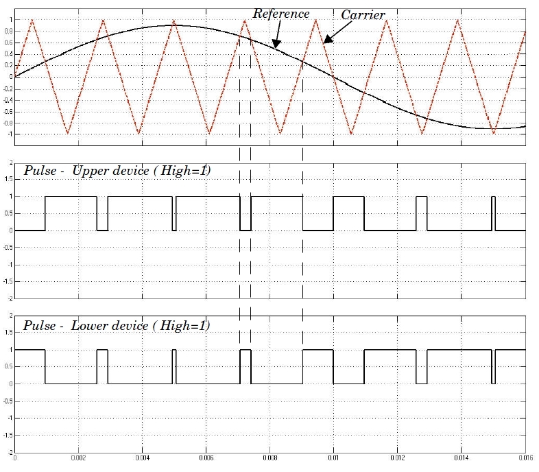 Импульсы сгенерированы путем сравнения треугольной формы волны несущей с сигналом модуляции ссылки. Сигналы модуляции могут быть сгенерированы самим генератором PWM, или они могут быть вектором из внешних сигналов, соединенных во входе блока. Один опорный сигнал требуется, чтобы генерировать импульсы для сингла - или мост 2D руки, и три опорных сигнала требуются, чтобы генерировать импульсы для трехфазного, одного или двойного моста.