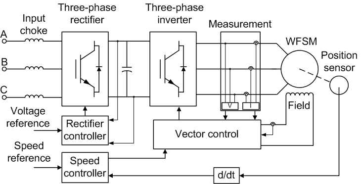 Блок Self-Controlled Synchronous Motor Drive (AC5) представляет классический векторный диск управления для поля раны синхронные двигатели. Этот диск показывает операцию коэффициента мощности единицы и регулировку скорости с обратной связью, на основе векторного метода управления. Операция коэффициента мощности единицы достигается через напряжение управляемый, трехфазный активный выпрямитель. Цикл регулировки скорости выводит ссылочный электромагнитный крутящий момент и поток статора машины. Прямая ссылка и квадратура (dq) компоненты статора текущее соответствие потоку статора, которым управляют, и крутящему моменту выведена на основе векторной стратегии управления. Они ссылаются на dq компоненты текущего статора, затем используются, чтобы получить необходимые сигналы логического элемента для инвертора через токовый контроллер гистерезисной полосы. Полевое напряжение, требуемое машиной, получено из цикла управления потока статора.