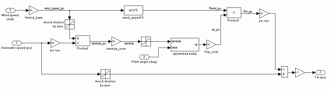 Simulink® модель турбины проиллюстрирована в следующем рисунке. Три входных параметров являются скоростью генератора (ωr_pu) в pu номинальной скорости генератора, угол тангажа в градусах и скорость ветра в m/s. Отношение скорости совета λ в pu λ _ имя получено делением рациональной скорости в pu основной скорости вращения (заданный ниже) и скорости ветра в pu основной скорости ветра. Выход является крутящим моментом, применился к валу генератора.