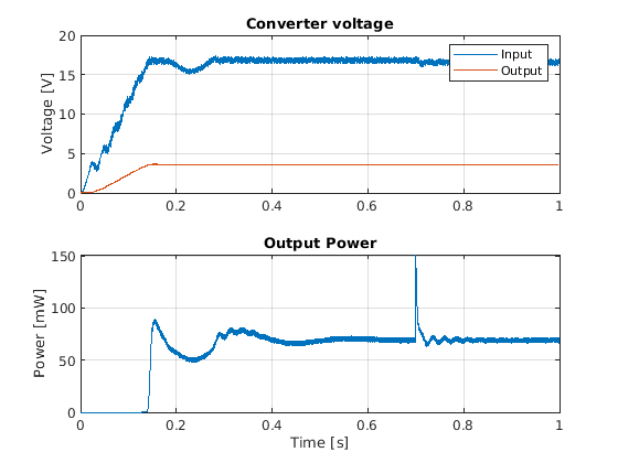Понижающий конвертер регулирует напряжение, чтобы передать максимальную возможную власть к загрузке и гарантирует, что передача власти однонаправлена. В этом примере импульсный генератор управляет конвертером в разомкнутом контуре с фиксированной частотой переключения и рабочим циклом. Если источник вибрации не имеет постоянной частоты, или он содержит гармоники, можно спроектировать более сложный контроллер с обратной связью, чтобы оптимизировать передачу власти и повысить эффективность энергетического комбайна в различных условиях.