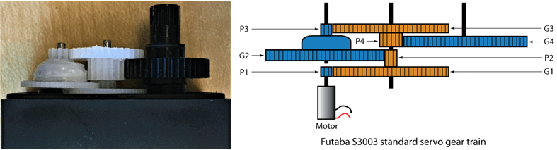 Сервомотор Futaba S3003 состоит из четырех пар нейлоновых механизмов, как проиллюстрировано на вышеупомянутом рисунке. Шестерня P1 на вале двигателя постоянного тока поймала в сети со ступенчатым механизмом G1. Шестерня P2 является прессованной частью ступенчатого механизма G1 и поймал в сети со ступенчатым механизмом G2. Шестерня P3, который является прессованной частью механизма G2, поймала в сети со ступенчатым механизмом G3. Свяжите P4, который прессуется с G3, сетками с итоговым механизмом G4, который присоединен к выходному сплайну. Ступенчатый механизм устанавливает G1 и P2, G2 и P3, и G3 и P4 являются свободными механизмами вращения то есть, они не присоединены к своим соответствующим валам. Набор механизмов диска обеспечивает 278:1 сокращение, идущее от частоты вращения двигателя 13 901 об/мин приблизительно к 50 об/мин в выходном сплайне, когда двигатель управляется на уровне 5 вольт. Следующая таблица обрисовывает в общих чертах зубное количество и теоретические значения выходной скорости, частот mesh механизма и совокупного сокращения механизма в каждой mesh механизма.