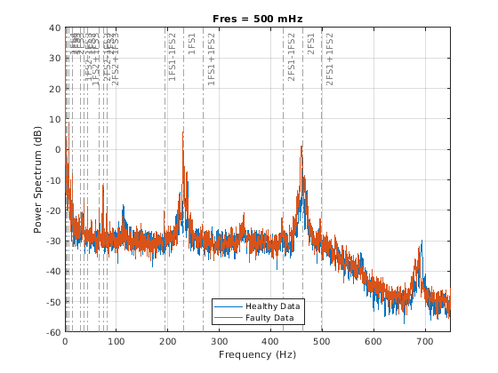 figure pspectrum(healthyCurrent,fs,'FrequencyResolution',0.5) hold on pspectrum(faultyCurrent,fs,'FrequencyResolution',0.5) hold on info1.Labels = regexprep(info1.Labels,'F0','FS1'); info1.Labels = regexprep(info1.Labels,'F1','FS2'); helperPlotXLines(info1,[0.5 0.5 0.5]) info2.Labels = regexprep(info2.Labels,'F0','FS2'); info2.Labels = regexprep(info2.Labels,'F1','FS3'); helperPlotXLines(info2,[0.5 0.5 0.5]) info3.Labels = regexprep(info3.Labels,'F0','FS3'); helperPlotXLines(info3,[0.5 0.5 0.5]) info4.Labels = regexprep(info4.Labels,'F0','FS4'); helperPlotXLines(info4,[0.5 0.5 0.5]) legend('Healthy Data','Faulty Data','Location','South') hold off