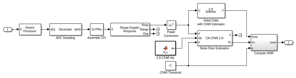 Compute SINR - Подсистема нормирует полученный сигнал с помощью вычисленного порога детектора CFAR, возвращая предполагаемый SINR в децибелах (дБ).