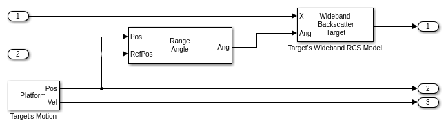 Platform - Используемый, чтобы смоделировать движение цели. Значения положения и скорости цели используются Wideband Two-Ray Channel блоки к распространению модели и Range Angle блокируйтесь, чтобы вычислить инцидентные углы сигнала в местоположении цели.