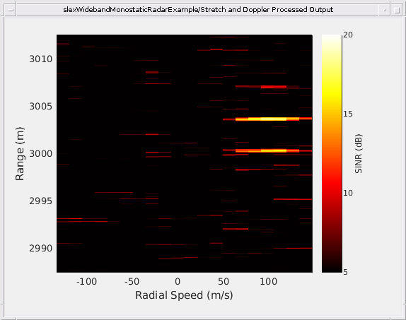 Несмотря на то, что только единая цель была смоделирована в этом примере, три цели возвращаются, наблюдаются в верхнем правом фрагменте фигуры. Многопутевые отражения вдоль передающих и приёмных путей дают начало второй и третьей цели, возвращается, часто называемый синглом - и двойной возврат возвращается соответственно. Ожидаемая область значений и радиальная скорость для цели вычисляются из параметров симуляции.