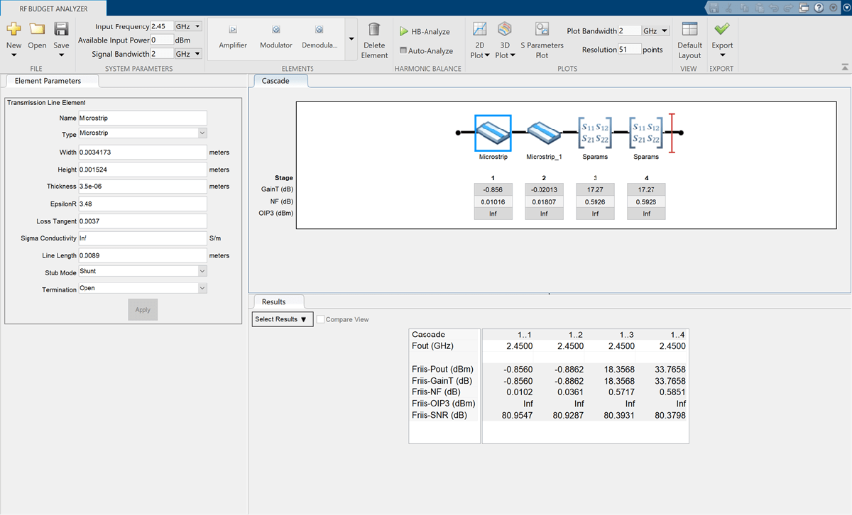 Спроектируйте систему RF и постройте S-параметры, выходную мощность и усиление преобразователя с помощью приложения RF Budget Analyzer.