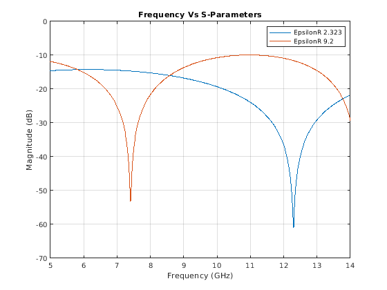 figure; sp1 = sparameters(cptxline1,freq); sp2 = sparameters(cptxline2,freq); rfplot(sp1,1,1);hold on; rfplot(sp2,1,1); title('Frequency Vs S-Parameters'); legend('EpsilonR 2.323','EpsilonR 9.2'); grid on;