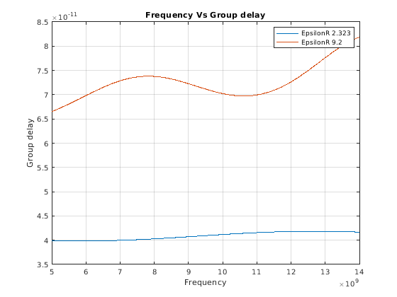 gd1 = groupdelay(cptxline1,freq,'Impedance',50); gd2 = groupdelay(cptxline2,freq,'Impedance',50); figure;plot(freq,gd1);hold on; plot(freq,gd2); title('Frequency Vs Group delay'); legend('EpsilonR 2.323','EpsilonR 9.2'); xlabel('Frequency'); ylabel('Group delay'); grid on;