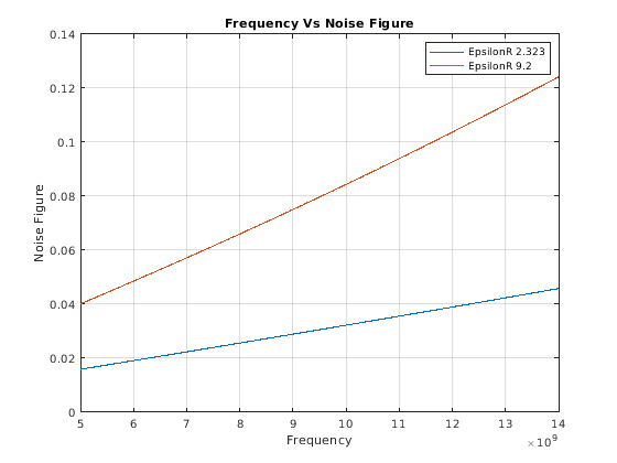nf1 = noisefigure(cptxline1,freq); nf2 = noisefigure(cptxline2,freq); figure;plot(freq,nf1);hold on; plot(freq,nf2); title('Frequency Vs Noise Figure'); legend('EpsilonR 2.323','EpsilonR 9.2'); xlabel('Frequency'); ylabel('Noise Figure'); grid on;