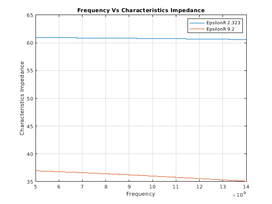 ChImp1 = getZ0(cptxline1,freq); ChImp2 = getZ0(cptxline2,freq); figure; plot(freq,ChImp1);hold on; plot(freq,ChImp2); title('Frequency Vs Characteristics Impedance'); xlabel('Frequency'); ylabel('Characteristics Impedance'); legend('EpsilonR 2.323','EpsilonR 9.2'); grid on;