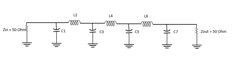 Рисунок показывает схематическую из смешанной модели элемента для 7-го порядка lowpass настройка LC-Pi.