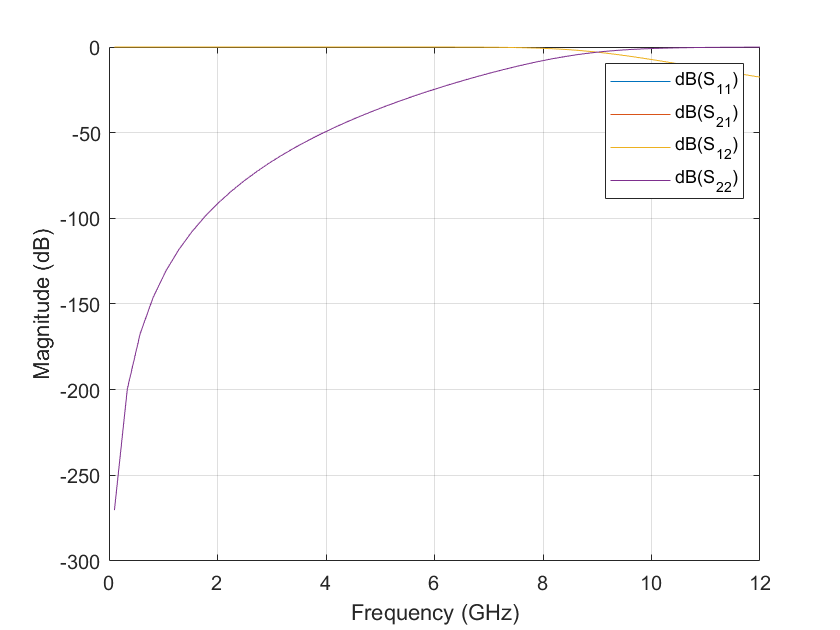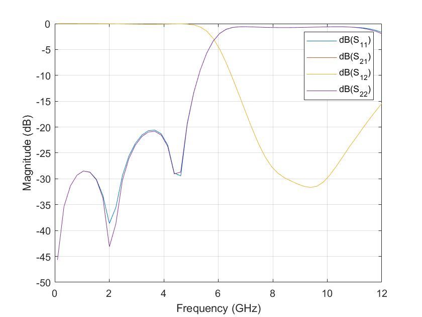 Lpfilter = rffilter('FilterType','Butterworth','ResponseType','LowPass', ... 'Implementation','LC pi','FilterOrder',obj.FilterOrder,'PassbandFrequency',freq,... 'PassbandAttenuation',3.0103,'Zin',50,'Zout',50,'Name','Filter'); spar = sparameters(Lpfilter,linspace(0.1e9,12e9,51)); figure; rfplot(spar);