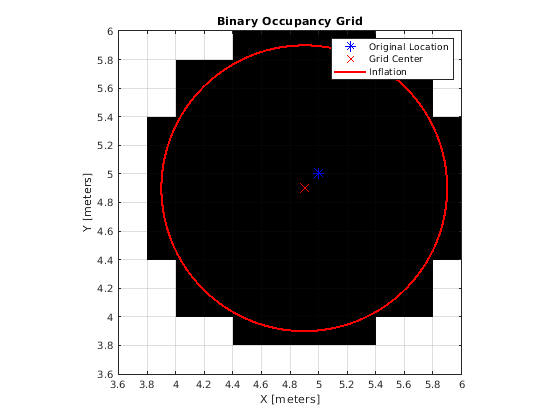 hold on theta = linspace(0,2*pi); x = 4.9+cos(theta); % x circle coordinates y = 4.9+sin(theta); % y circle coordinates plot(5,5,'*b','MarkerSize',10) % Original location plot(4.9,4.9,'xr','MarkerSize',10) % Grid location center plot(x,y,'-r','LineWidth',2); % Circle of radius 1m. axis([3.6 6 3.6 6]) ax = gca; ax.XTick = [3.6:0.2:6]; ax.YTick = [3.6:0.2:6]; grid on legend('Original Location','Grid Center','Inflation')