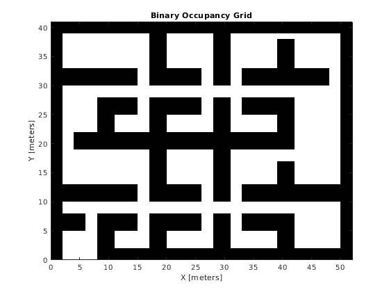Используйте импортированный simpleMap данные и построение представление сетки заполнения с помощью binaryOccupancyMap объект. Установите разрешение 2 ячеек на метр для этой карты.