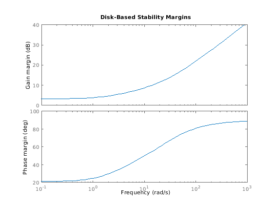 [ вычисляет находящиеся на диске запасы устойчивости для SISO или цикла отрицательной обратной связи MIMO DM,MM] = diskmargin(L)feedback(L,eye(N)), где N количество вводов и выводов в L.