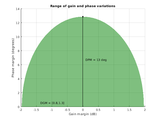 Соедините, эти результаты показывают, что в отсутствие изменения фазы, устойчивость обеспечена для относительных изменений усиления между 0,4 и 1.72. Чтобы видеть, как запас по фазе зависит от этих изменений усиления, постройте устойчивые области значений усиления и изменений фазы для каждого diskmargin результат.