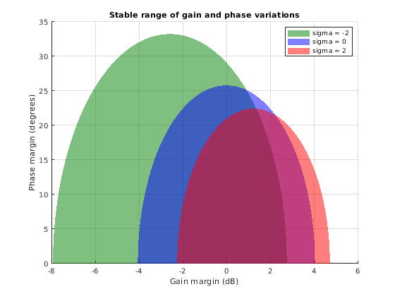 Таким образом, варьируясь скошенный sigma может дать более полное изображение чувствительности к неопределенности фазы и усилению. Если вы в основном не обеспокоены изменениями усиления одного направления (увеличение или уменьшение), не рекомендуется сделать выводы из одного ненулевого значения sigma. Вместо этого используйте sigma по умолчанию = 0, чтобы получить объективные оценки запасов по амплитуде и фазе. При использовании ненулевых значений sigma, используйте и положительные и отрицательные величины, чтобы сравнить относительную чувствительность, чтобы получить увеличение и уменьшение.
