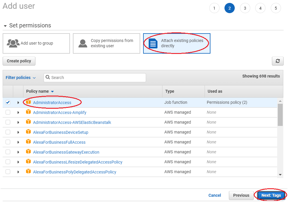 Следуйте за подсказками, чтобы установить полномочия. Этот рисунок показывает пример установки полномочий для вашего я пользователь AM. Поскольку у вас должны быть полномочия администрирования получить доступ к сервисам AWS, выберите AdministratorAccess политика от Присоединения существующие политики непосредственно политики.