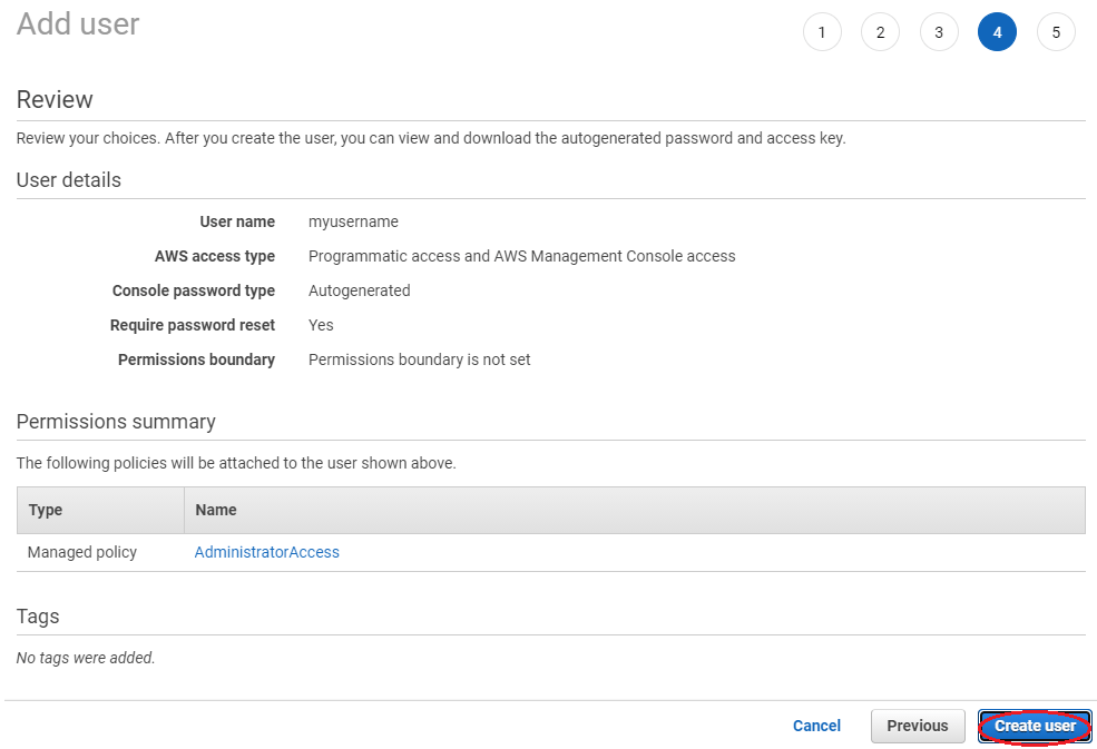 Следуйте за подсказками, чтобы рассмотреть детали вашего я пользователь AM и Создать пользователя. Этот рисунок показывает пример меня пользовательские детали AM, сводные данные разрешения и присоединенные политики для этого примера.