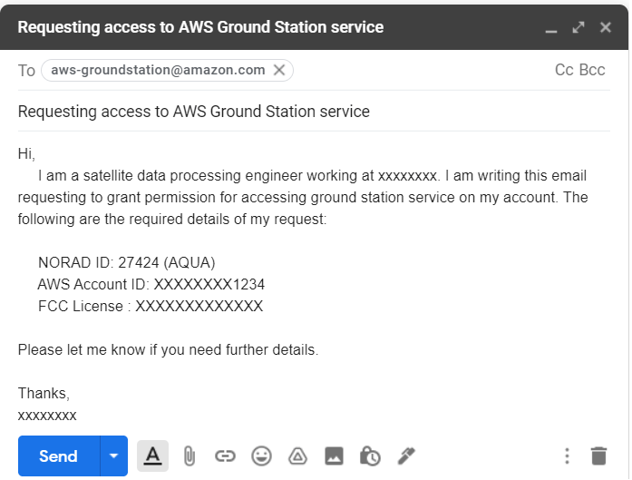 Получить доступ к сервисам наземной станции на вашу учетную запись, электронное письмо aws-groundstation@amazon.com с ID NORAD, информация о лицензии FCC (см., что FCC лицензирует), и ID учетной записи AWS.
