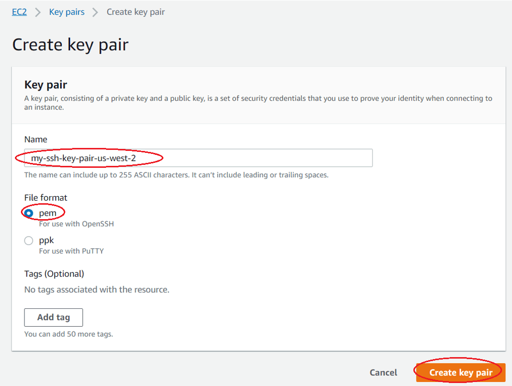 Задайте уникальное имя для своей пары ключей EC2 и выберите формат файла как .pem сохранить закрытый ключ. Нажмите пару ключей Create, чтобы создать пару ключей EC2.