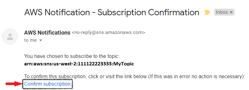 Этот рисунок показывает демонстрационное уведомление по электронной почте от сервиса Уведомления AWS. В уведомлении по электронной почте щелкните по ссылке "Confirm subscription", чтобы получить уведомления SNS.