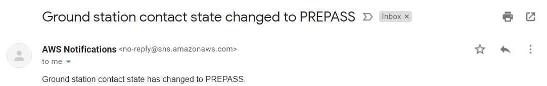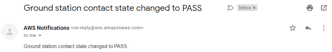 PASS: Длительность контакта, который вы запланировали, вы получаете событие SNS, указывающее, что получающие спутниковые данные запустились. Этот рисунок показывает пример состояния контакта наземной станции, измененного на PASS.
