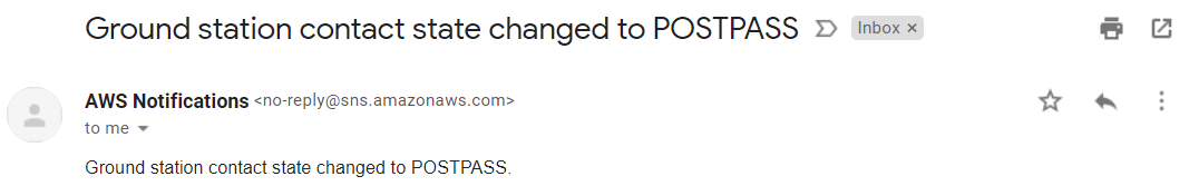 POSTPASS: После одной минуты времени передачи вы получаете событие SNS, указывающее, что передача закончилась. Этот рисунок показывает пример состояния контакта наземной станции, измененного на POSTPASS.