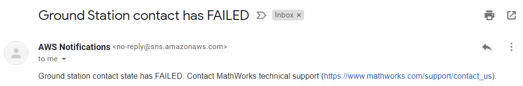 FAILED: Если какие-либо отказы происходят во время изменения состояния контакта, то вы получаете событие SNS, указывающее, что контакт перестал работать. В этом случае свяжитесь с технической поддержкой MathWorks(R). Для получения дополнительной информации смотрите Поддержку Контакта на веб-сайте MathWorks. Этот рисунок показывает пример состояния контакта наземной станции, измененного на FAILED.