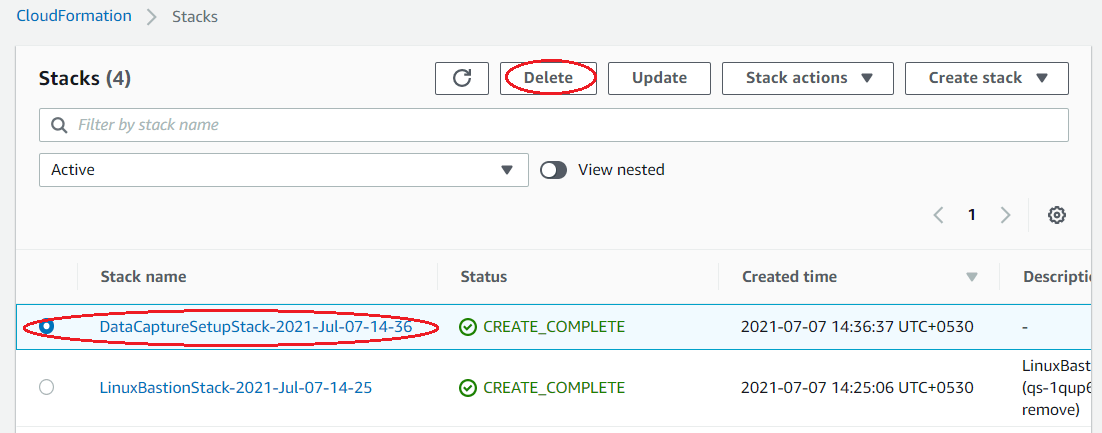 На Консольном веб-сайте Формирования Облака AWS и выборе стек, чтобы удалить. Стеки, созданные в этом примере, называют с префиксным LinuxBastionStack, DataCaptureSetupStack, и помечены с префиксом MW_App и SatComToolbox.