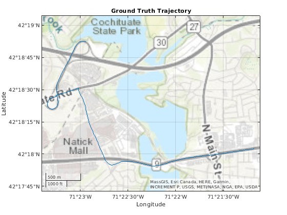 Загрузите MAT-файл, который содержит положение основной истины и скорость наземного транспортного средства, перемещающегося к Натику, кампусу MA MathWorks, Inc.