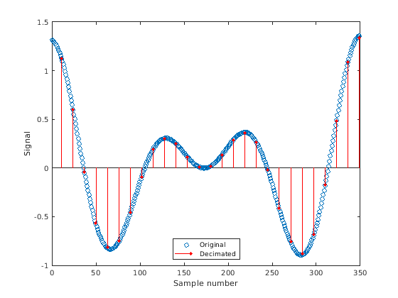 Наконец, decimate передискретизирует данные путем выбора каждого rth указывают от внутренней части отфильтрованного сигнала. В передискретизируемой последовательности (y), y(end) соответствия x(end) когда БИХ-фильтр используется, и y(1) соответствия x(1) когда КИХ-фильтр используется.