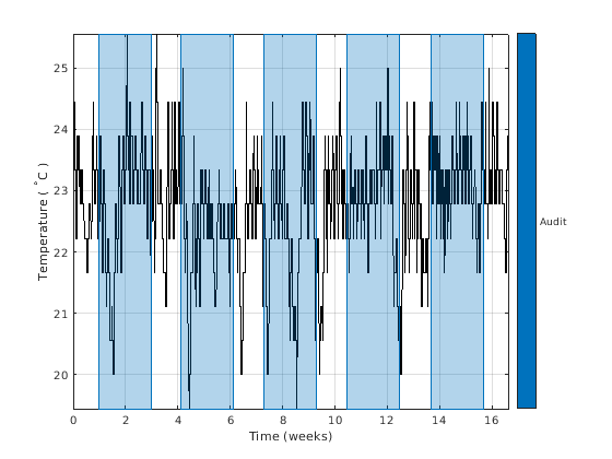 fs = 48;Создайте пределы видимой области (ROI), которые соответствуют пяти случайным 2D недельным периодам, разделенным по крайней мере на 24 часа. Используйте температурные показания с этих дней для аудита.