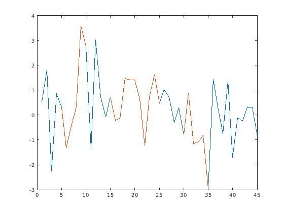 plot(x) hold on for kj = 1:length(sigroi) plot(roilims(kj,1):roilims(kj,2),sigroi{kj}) end hold off