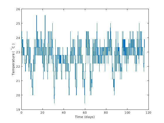 load officetemp tempC = (temp-32)*5/9; fs = 48; t = (0:length(tempC) - 1)/fs; plot(t,tempC) xlabel('Time (days)') ylabel('Temperature ( {}^\circC )')