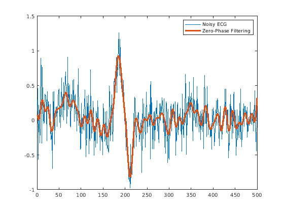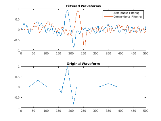 нулевая фаза фильтрует входные данные, y = filtfilt(d,x)x, с помощью цифрового фильтра, dИспользование designfilt сгенерировать d на основе технических требований частотной характеристики.