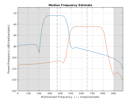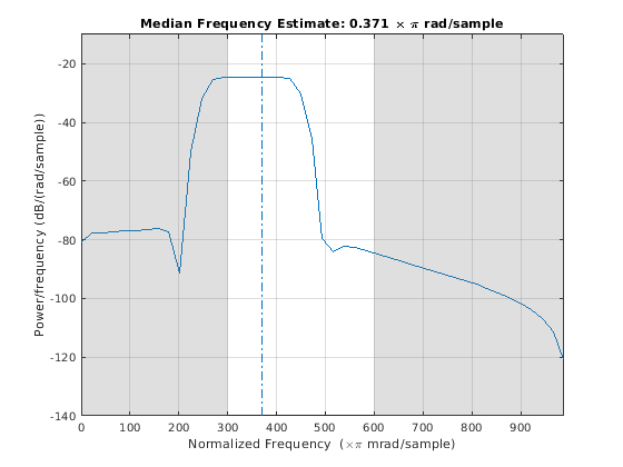 medfreq(___) без выходных аргументов строит PSD или спектр мощности и аннотирует медианную частоту.