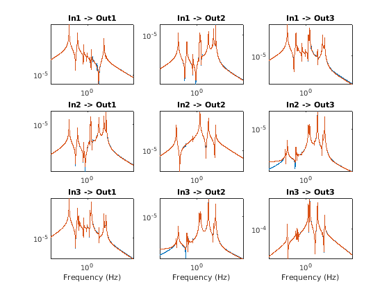for ij = 1:3 for ji = 1:3 subplot(3,3,3*(ij-1)+ji) loglog(f,abs(frf(:,ji,ij))) hold on loglog(f,abs(ofrf(:,ji,ij))) hold off axis tight title(sprintf('In%d -> Out%d',ij,ji)) if ij==3 xlabel('Frequency (Hz)') end end end