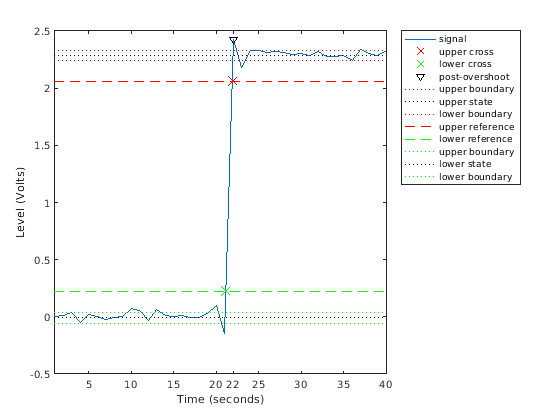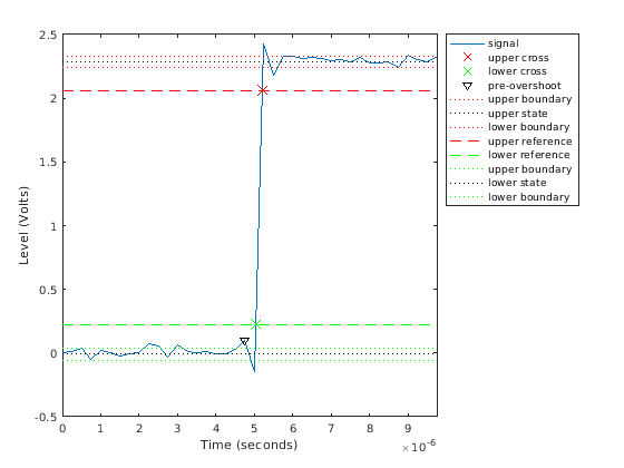 overshoot(___) строит двухуровневый сигнал и отмечает местоположение перерегулирования каждого перехода. Функция также строит более низкие и верхние моменты контрольного уровня и сопоставленные контрольные уровни и государственные уровни и сопоставленный ниже - и верхние государственные границы.