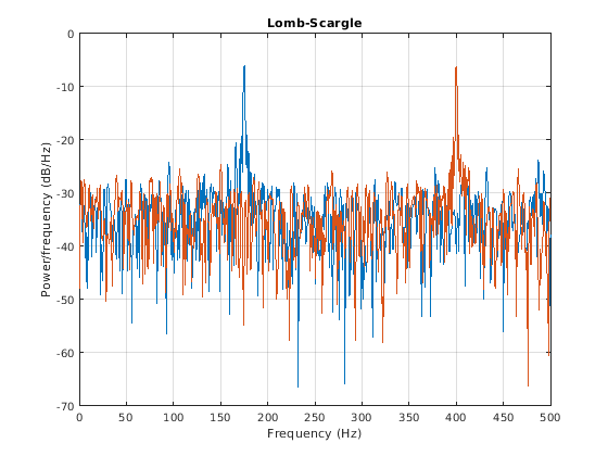 = plomb(x,t)pxx, из сигнала, x, это производится в моменты, заданные в tT должен увеличиться монотонно, но нуждаться быть расположенными неравными интервалами. Все элементы t mustBeNonnegative. pxx оценен на частотах, возвращенных в f.