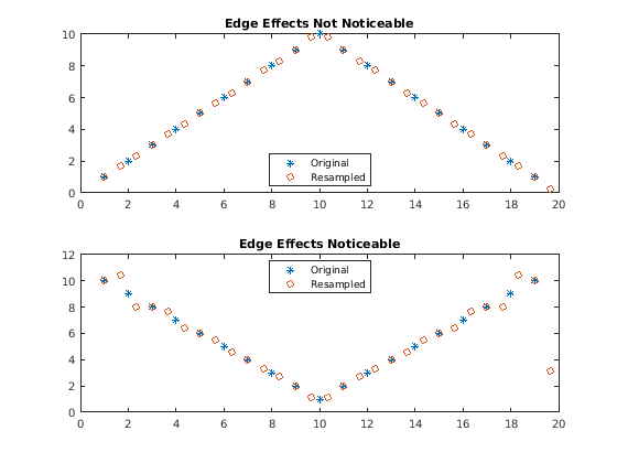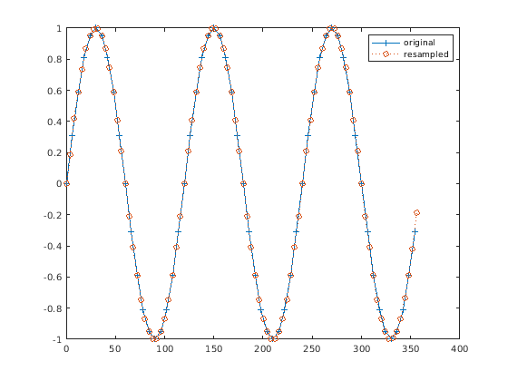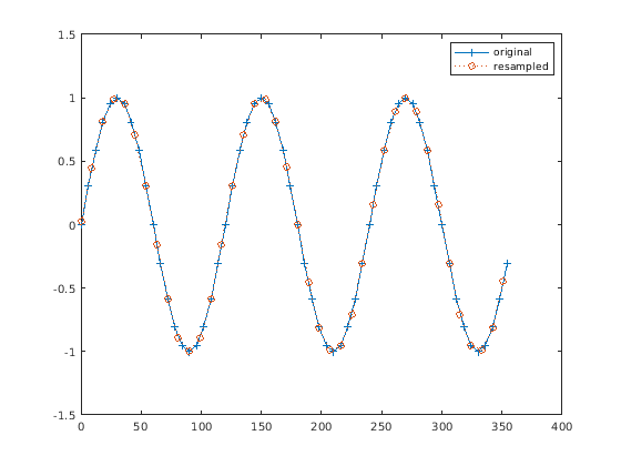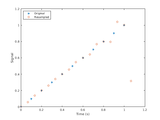 передискретизирует значения, y = resample(x,tx)x, из сигнала, произведенного в моменты, задан в векторном tx. Функция интерполирует x линейно на вектор однородно расположенных с интервалами моментов с теми же конечными точками и количеством отсчетов как txNaNs обработаны как недостающие данные и проигнорированы.