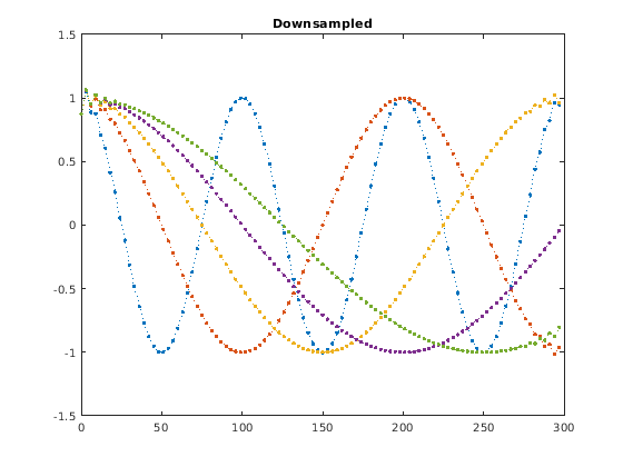 передискретизирует входную последовательность, y = resample(x,p,q)x, в pQ раз от исходной частоты дискретизации. resample применяет КИХ, Сглаживающего Фильтр Lowpass к x и компенсирует задержку, введенную фильтром. Функция действует вдоль первого измерения массива с размером, больше, чем 1.