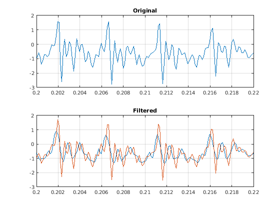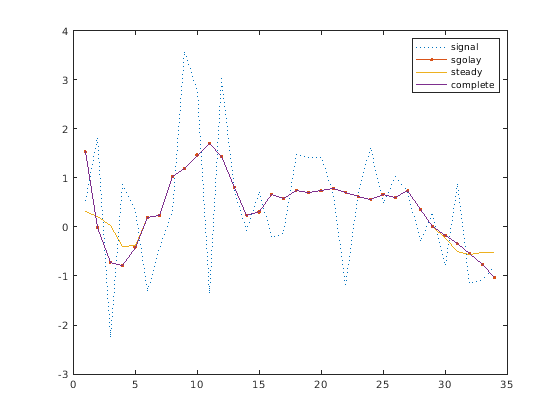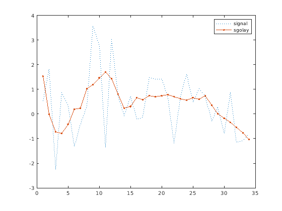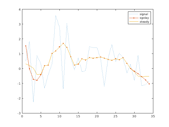 Фильтры Savitzky-Golay оптимальны в том смысле, что они минимизируют ошибку наименьших квадратов в подборе кривой полиному к системам координат зашумленных данных. Смотрите sgolay для получения дополнительной информации об алгоритме Savitzky-Golay.