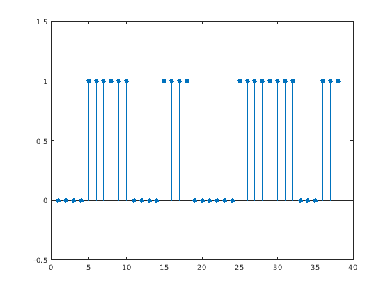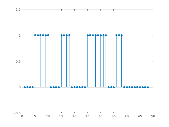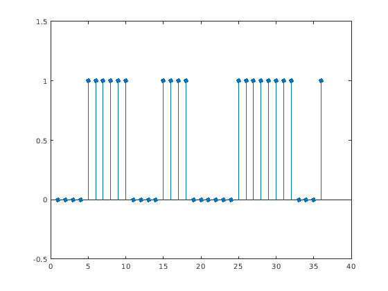 Рассмотрите матрицу 2D столбца начала и выборки конца четырех возможных необходимых областей сигнала. Преобразуйте пределы ROI последовательности логических операций и отобразите последовательность.
