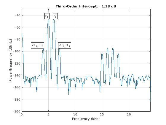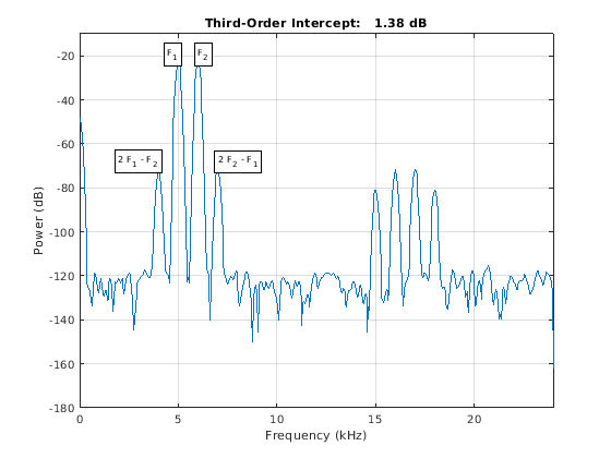 toi(___) без выходных аргументов строит спектр сигнала и аннотирует более низкие и верхние основные принципы (f 1, f 2) и продукты интермодуляции (2f1 – f 2, 2f2 – f 1). Более высокие гармоники и продукты интермодуляции не помечены. TOI появляется выше графика.