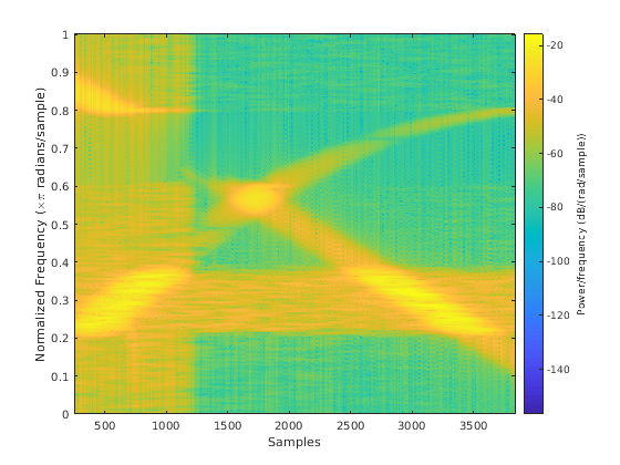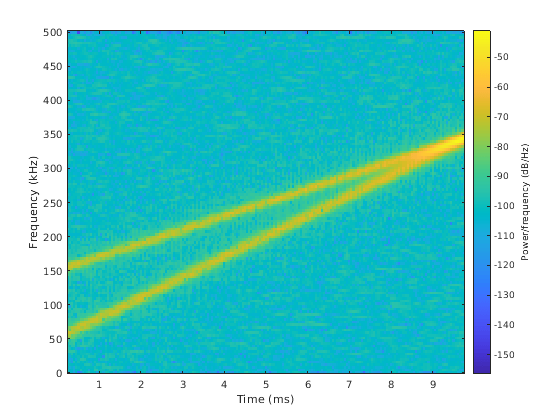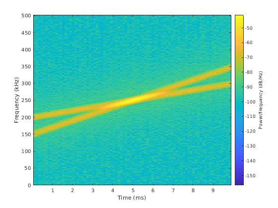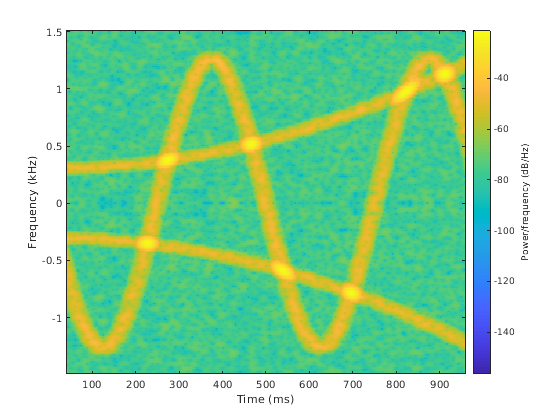 [___] = xspectrogram(___, возвращает краткосрочные оценки взаимной спектральной плотности мощности если spectrumtype)spectrumtype задан как 'psd' и возвращает краткосрочные перекрестные оценки спектра мощности если spectrumtype задан как 'power'.