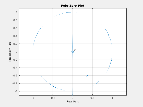 где нулевая средняя последовательность белого шума с некоторым заданным отклонением. В этом примере примите отклонение и период выборки, чтобы быть 1. Чтобы симулировать предыдущий AR (2) процесс, создайте все-полюс (БИХ) фильтр. Просмотрите ответ величины фильтра.