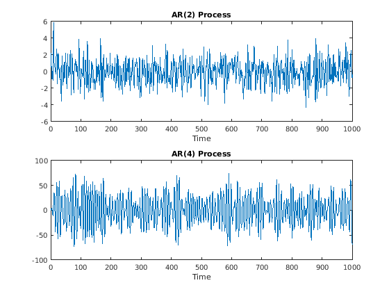 rng default x = randn(1e3,1); y2 = filter(B2,A2,x); y4 = filter(B4,A4,x); subplot(2,1,1) plot(y2) title('AR(2) Process') xlabel('Time') subplot(2,1,2) plot(y4) title('AR(4) Process') xlabel('Time')