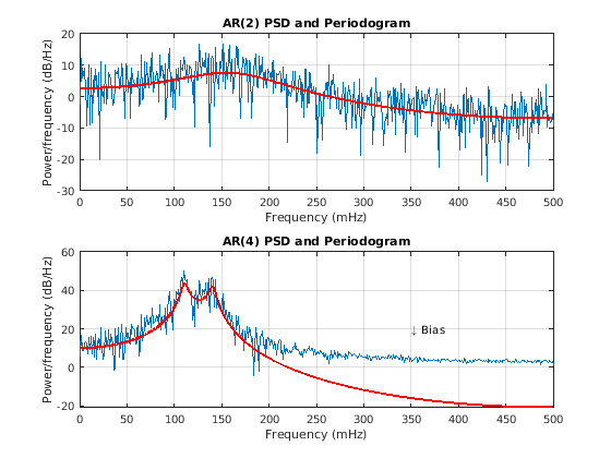 Fs = 1; NFFT = length(y2); subplot(2,1,1) periodogram(y2,rectwin(NFFT),NFFT,Fs) hold on plot(1000*W2,20*log10(abs(H2)),'r','linewidth',2) title('AR(2) PSD and Periodogram') subplot(2,1,2) periodogram(y4,rectwin(NFFT),NFFT,Fs) hold on plot(1000*W4,20*log10(abs(H4)),'r','linewidth',2) title('AR(4) PSD and Periodogram') text(350,20,'\downarrow Bias')