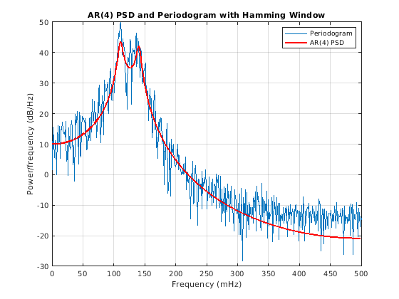 figure periodogram(y4,hamming(length(y4)),NFFT,Fs) hold on plot(1000*W4,20*log10(abs(H4)),'r','linewidth',2) title('AR(4) PSD and Periodogram with Hamming Window') legend('Periodogram','AR(4) PSD')